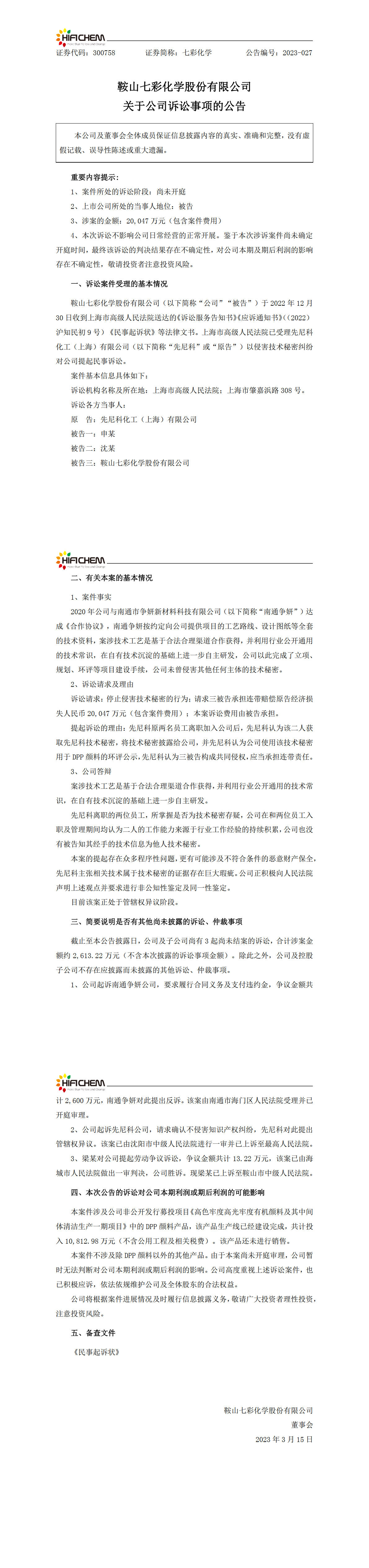 上述兩件民事案件即七彩化學(xué)在2023年3月15日公告中所披露的民事案件。