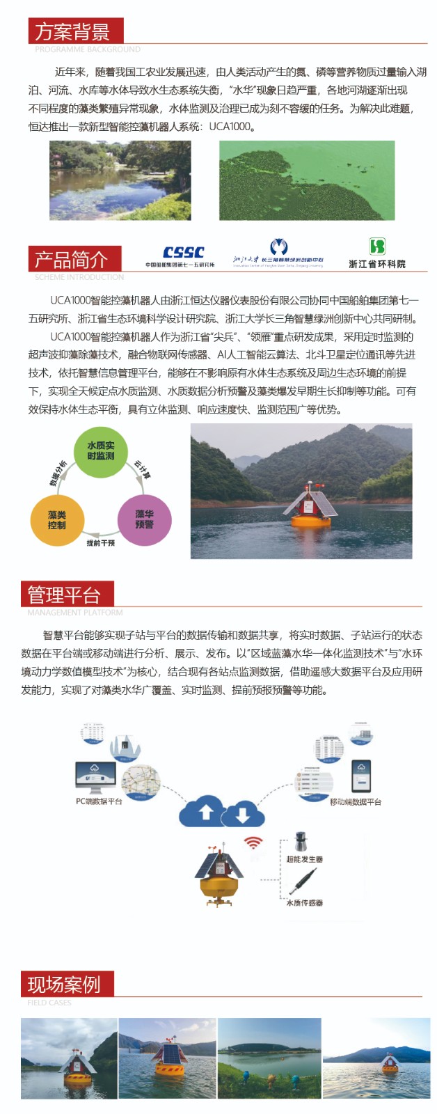 UCA1000智能控藻機(jī)器人由浙江恒達(dá)儀器儀表股份有限公司協(xié)同中國(guó)船舶集團(tuán)第七一 五研究所、浙江省生態(tài)環(huán)境科學(xué)設(shè)計(jì)研究院、浙江大學(xué)長(zhǎng)三角智慧綠洲創(chuàng)新中心共同研制。 UCA1000智能控藻機(jī)器人作為浙江省“尖兵”、“領(lǐng)雁”重點(diǎn)研發(fā)成果,采用定時(shí)監(jiān) 測(cè)的超聲波抑藻除藻技術(shù),融合物聯(lián)網(wǎng)傳感器、AI人工智能云算法、北斗衛(wèi)星定位通訊等 先進(jìn)技術(shù),依托智慧信息管理平臺(tái),能夠在不影響原有水體生態(tài)系統(tǒng)及周邊生態(tài)環(huán)境的前 提下,實(shí)現(xiàn)全天候定點(diǎn)水質(zhì)監(jiān)測(cè)、水質(zhì)數(shù)據(jù)分析預(yù)警及藻類爆發(fā)早期生長(zhǎng)抑制等功能。可 有效保持水體生態(tài)平衡,具有立體監(jiān)測(cè)、響應(yīng)速度快、監(jiān)測(cè)范圍廣等優(yōu)勢(shì)。 |