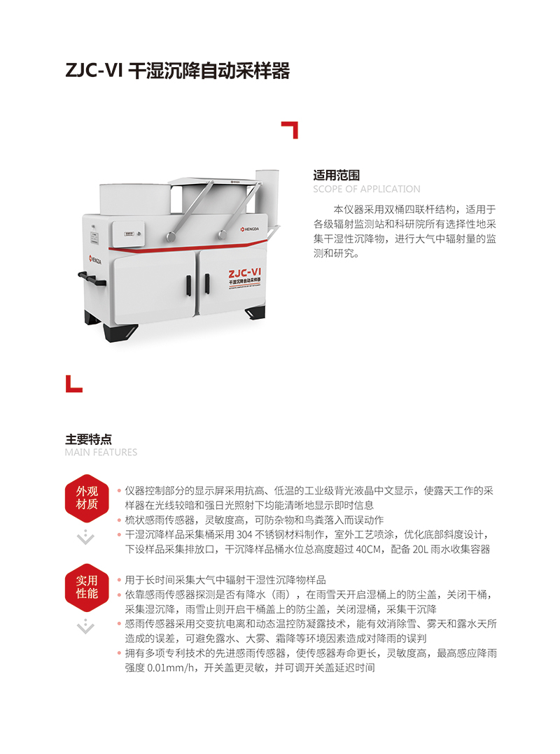 本儀器采用雙桶四聯(lián)桿結(jié)構(gòu),適用于各級輻射監(jiān)測站和科研院所有選擇性地采集干濕性沉降物,進行大氣中輻射量的監(jiān)測和研究。